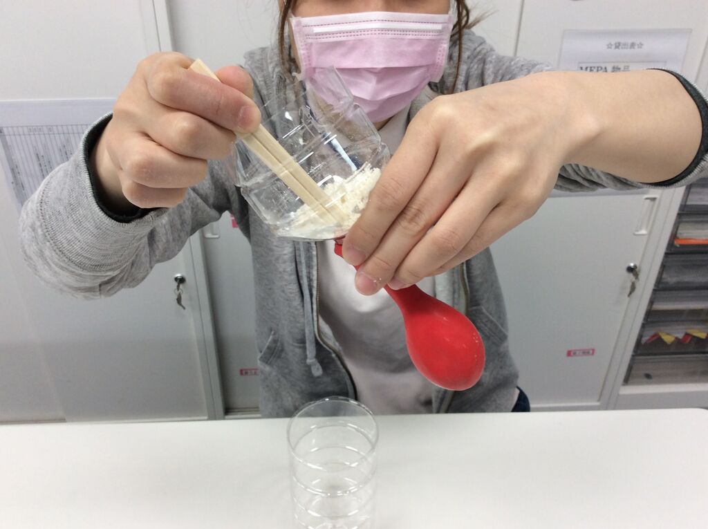 割り箸でつつきながら、少しずつ風船の中へ粉を入れていく。