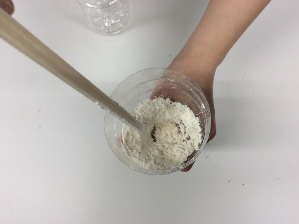 粉をこぼさないように割り箸でつつく、ペットボトルを押さえるなど