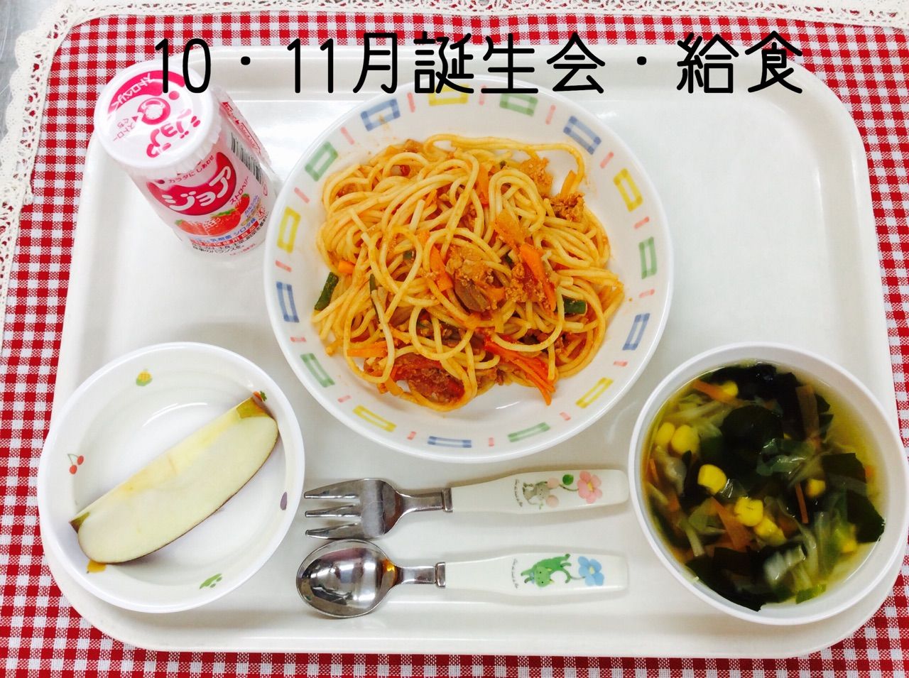 2014年11月30日 10月・11月誕生会 10・11月誕生会 【給食】 スパゲティーナポリタン・中華スープ・りんご・ジョア主食と主菜が一緒にとれる麺類は子どもたちにも人気メニューです。スープにはわかめと甘味の出るコーンや玉ねぎを使いました。果物は旬のりんごを。りんごは1/8の大きさです。かじりとりと咀嚼を促すようにしています。個々の咀嚼力に合わせて、薄くするなど確認しながら提供しています。試食会には6名の保護者様にご参加いただきました。ありがとうございました。 【おやつ】チーズケーキクリームチーズとヨーグルトでしっとりと焼き上げました。