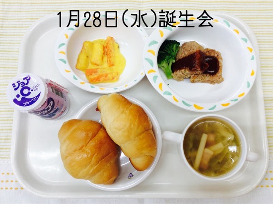 2015年02月01日 12月・1月誕生会 12月・1月誕生会が行われました。 【給食】ロールパン・ミートローフ・蒸し野菜添え・にんじんのコーン煮マカロニスープ・ジョア空風のロールパンは香りよく、食パンに並んで人気パンです。ミートローフにも野菜を入れて、じっくり焼きました。コーンクリーム缶で煮たにんじんはスティック状に切りましたが野菜が苦手なお子さんもチャレンジできた1品となりました。お弁当のおかずにも彩りを添えておすすめです。誰でも簡単に作れます。色の濃い野菜は免疫力を高めてくれるので、風邪予防にもよいです。給食の試食会には12名の保護者様にご参加いただきました。ありがとうございました。 【おやつ】フルーツインゼリー