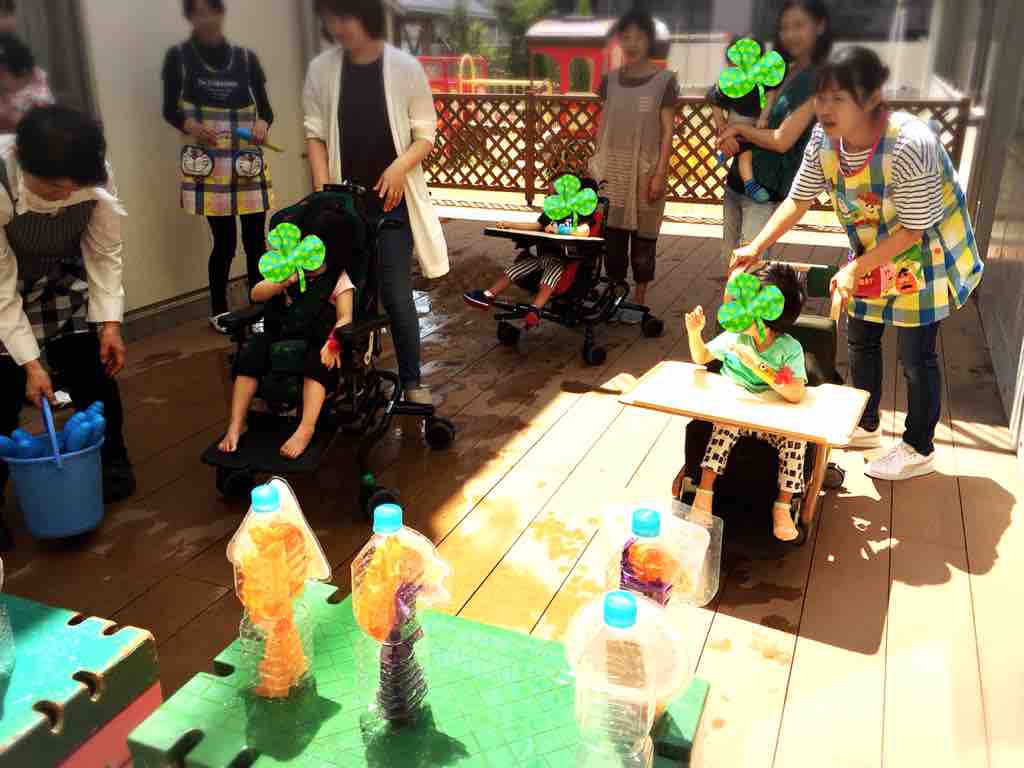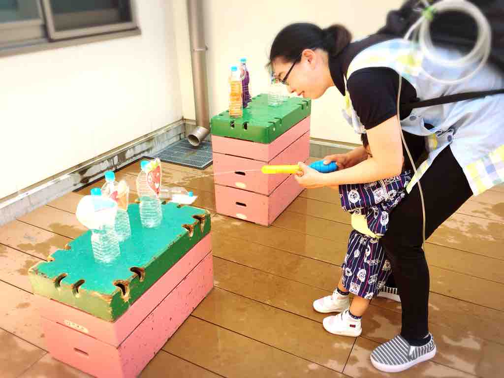 水鉄砲で、的を狙って沢山倒そう❣️
