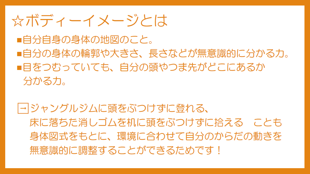 このような運動遊びを通して、『ボディーイメージの発達』を促していくことができます☆